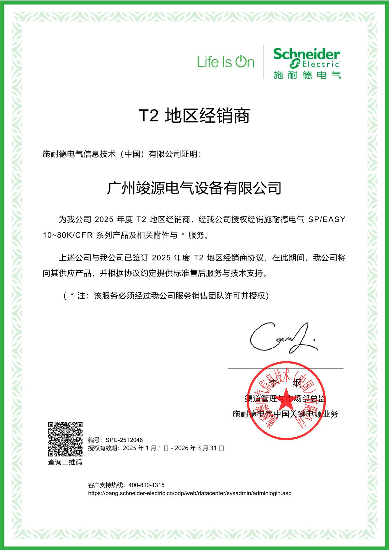施耐德授權代理證